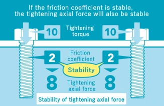 When the friction coefficient it stable, it is possible to obtain a stable tightening axial force without any variantion in all bolts when tightening with the same tightening torque.