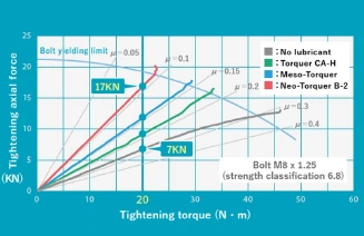 When the tightening torque is 20N*m, with M8 x 1.25 bolts (strength classification 6.8), only 7KN of tightening axial force can be obtained with non-lubricated bolts. However, when Neotorquer is applied, a tightening axial force of 17KN can be obtained.