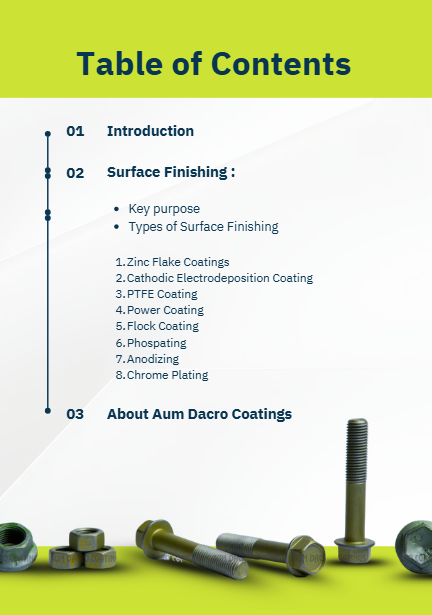 In addition, the eBook also covers several important surface finishing technologies including Zinc Thermal Diffusion (Sherardizing), Cathodic Electrodeposition (CED / E-Coating), PTFE Coatings, Powder Coating, Phosphating, Anodizing, and Chrome Plating. Each coating is explained with its applications across fasteners, automotive components, engine parts, structural assemblies, and consumer products.